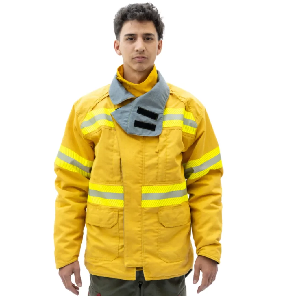 Η περιοχή του γιακά προσφέρει ασφαλές κλείσιμο, ενώ τα ανθεκτικά στη φωτιά υλικά του αποτρέπουν τη μεταφορά θερμότητας. Οι τσέπες του αυξάνουν τη χωρητικότητα αποθήκευσης και την ασφάλεια. Τα μπουφάν προσαρμόζονται με θερμική μεταφορά στο πίσω μέρος της στολής και ειδικές ραφές στα μανίκια.