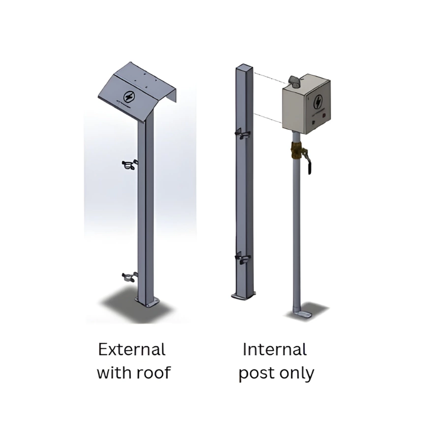 When the EV FirePro Plus is not installed against a wall, a post is required to support the control box and associated fittings. The post provides a stable mounting point for the system’s controls and ensures a clean, professional installation finish. Three post configurations are available: