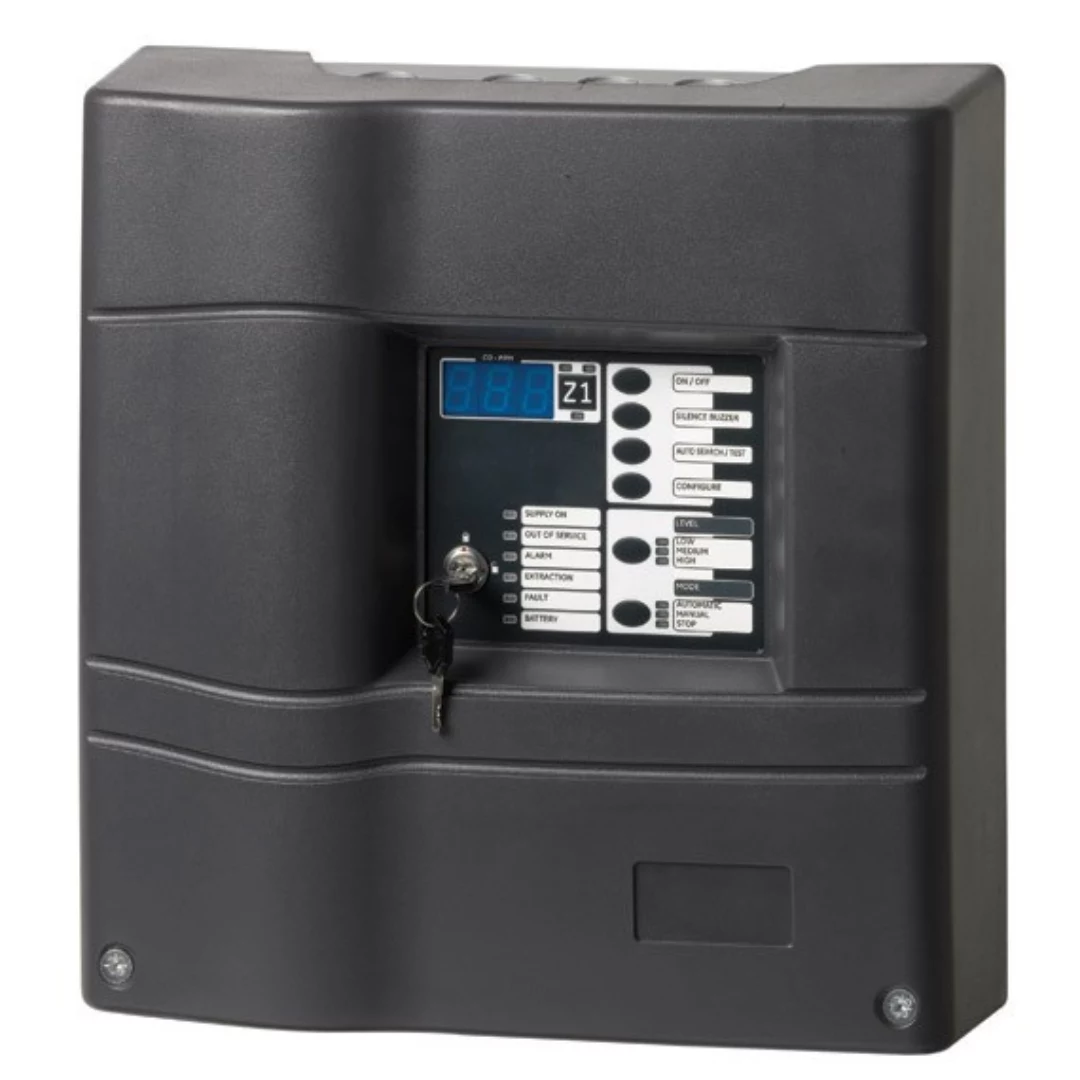 Ideal for car garages. Easy to use, elegant design. Features a clear display for monoxide levels/zone. Accepts up to 15 detectors/zone (KM170 or KMD300). Includes the necessary outputs (3 relays/zone) 220VAC / 95W (MAX) Operating voltage/zone 10~20VDC.