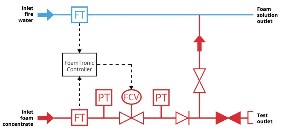 The FoamTronic® test procedure ensures the successful operation of the system. During this test (Test Mode) the firefighting foam injection point in the supply system is isolated and the foam supply is diverted in another direction to be collected and re-stored. At the same time, however, the water flow starts and the FoamTronic® system begins to control the mixing ratio. A complete operational test of the FoamTronic® system is therefore achieved without the consumption of foam concentrate and without the generation of foam solution. The complete test procedure is economical and environmentally friendly without the need for any cleaning.