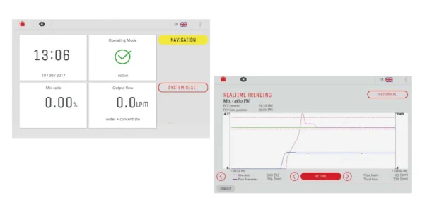 Thanks to the innovative technology of the FoamTronic® system, which combines modern measuring instruments and a special flow control valve, it is possible to achieve a very precise mixing ratio. Furthermore, the system is able to generate two different mixing ratios depending on the activation command received by the system. The required mixing ratios can be set using the user interface, on the touch screen.