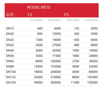 FoamTronic® and the components selected are adapted to suit the requirements of the project, always ensuring optimum operation. The sizing and model of the FoamTronic® depends on the variations in pressure and quantity of water passing through the control valve during system operation. FoamTronic® can be adapted to suit each application. Technical examples can be found in the table below and relate to firefighting foam admixture ratios of 1% and 3%. The FoamTronic® system up to model DN50 fits into a standard sized cabin. Larger sizes are available and manufactured to order. For other sizes and firefighting foam admixture ratios, please contact us.