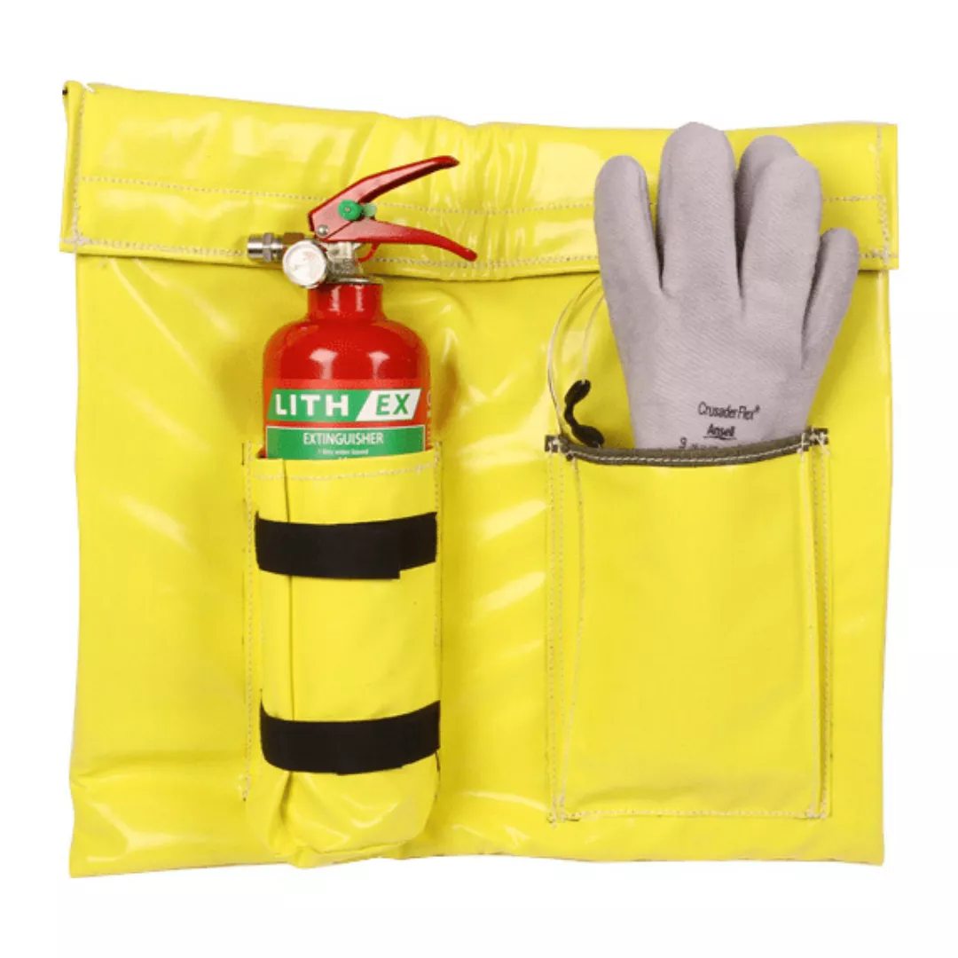 • Set with a fireproof case, safety gloves, safety glasses and a 1 litre Lith-Ex fire extinguisher