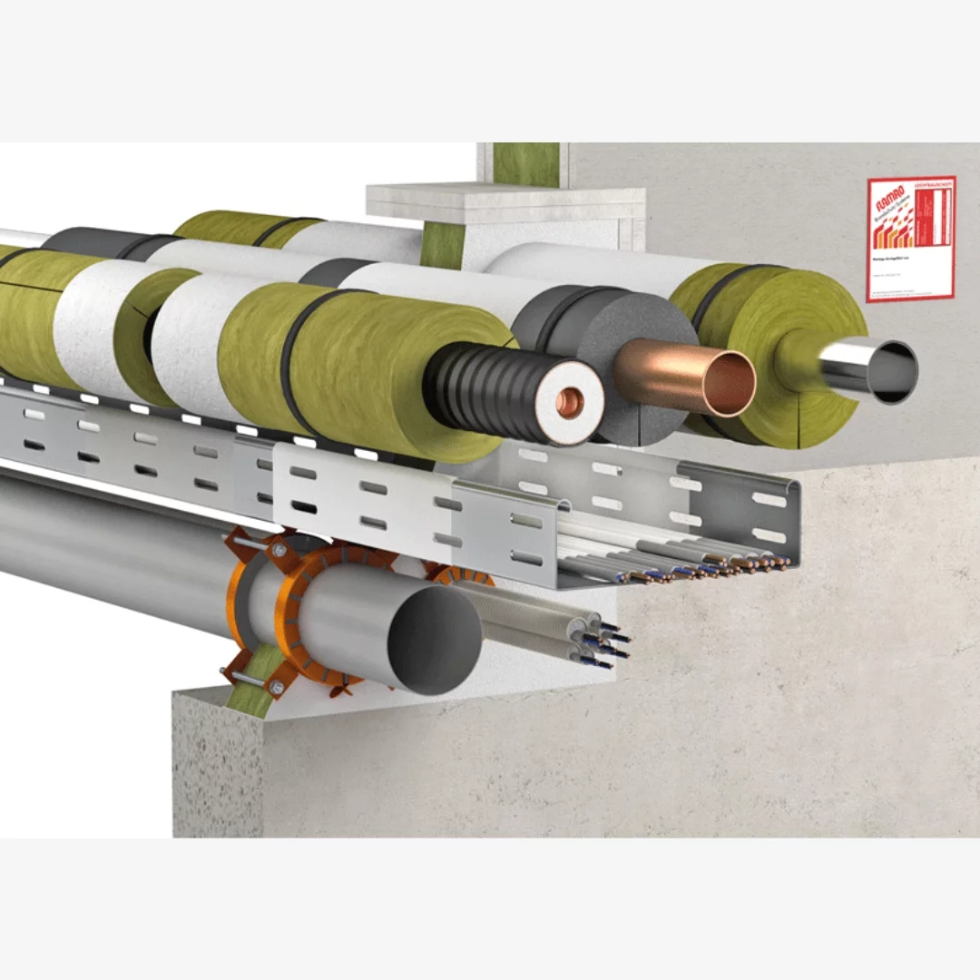 Cable and cable supporting structures, conduits and sectional insulations must be coated with FLAMRO BMA on both sides of the penetration seal with a length of 25 cm and a thickness of about 2 mm.