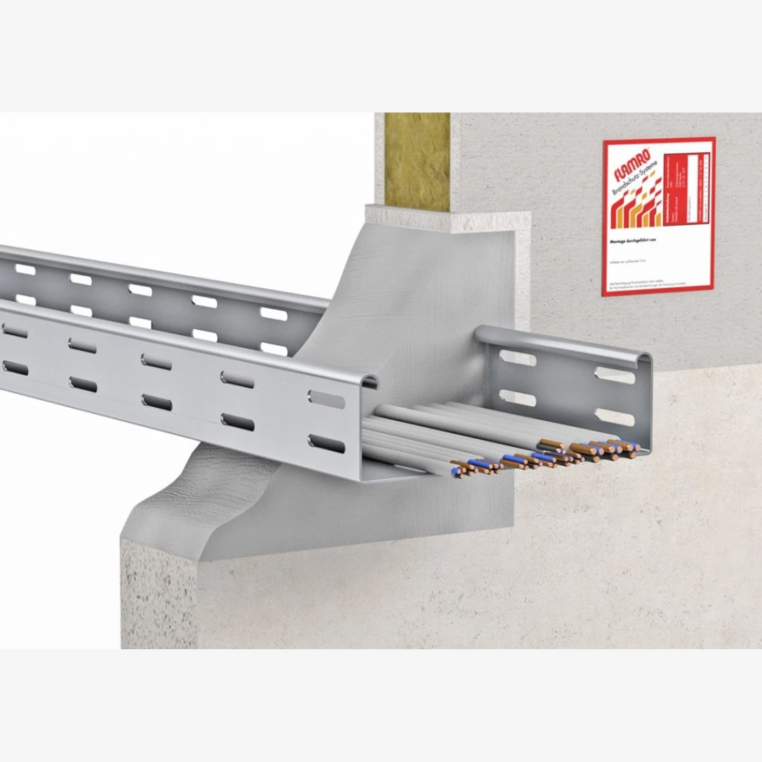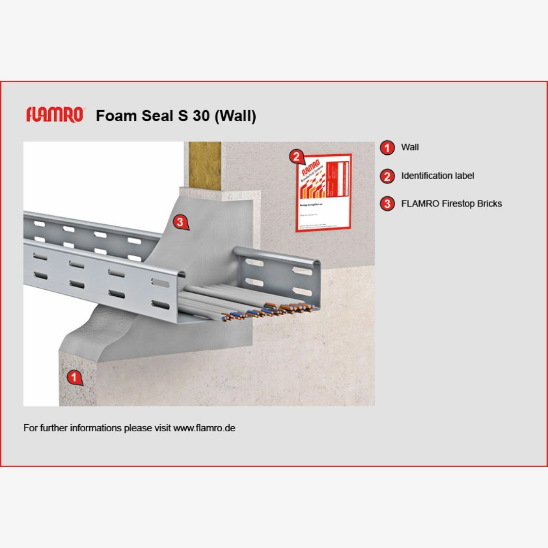 The cable penetration seal must be permanently labelled by the installation company. The identification label, which is available from FLAMRO Brandschutz-Systeme GmbH, has to be affixed to the building component next to the seal.