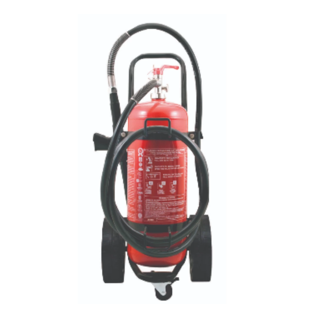 Τροχήλατος Πυροσβεστήρας, 50Kg Ξηράς Σκόνης ABC 40%, με Λάστιχο Εκτόξευσης Υλικού 5 μέτρων και με κλείστρο με Βαλβίδα Ασφαλείας Μανομέτρου.